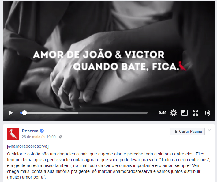 No dia 26 de maio, a marca de roupas Reserva lançou uma campanha de Dia dos Namorados em um vídeo onde os protagonistas João e Victor, um casal homossexual, conta sua história de relacionamento. Três dias depois o vídeo já tinha 34 mil visualizações, 320 compartilhamentos, 391 comentários e mais de 2,5 mil reações (positivas e negativas).