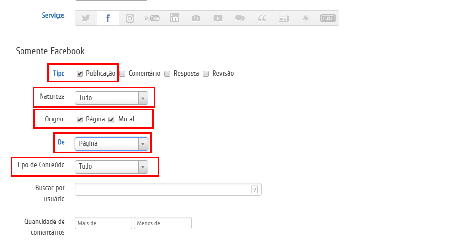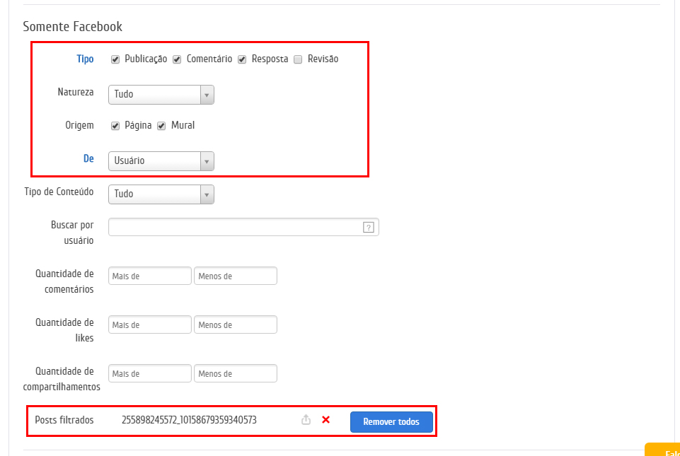 4 – Em “Somente Facebook”, marque a caixa de “Comentário” e “Respostas”. Em “De” selecione a opção “Usuário”. Note que agora há um campo de “Posts filtrados” com o ID do post que você adicionou aos filtros do seu relatório para isolar.