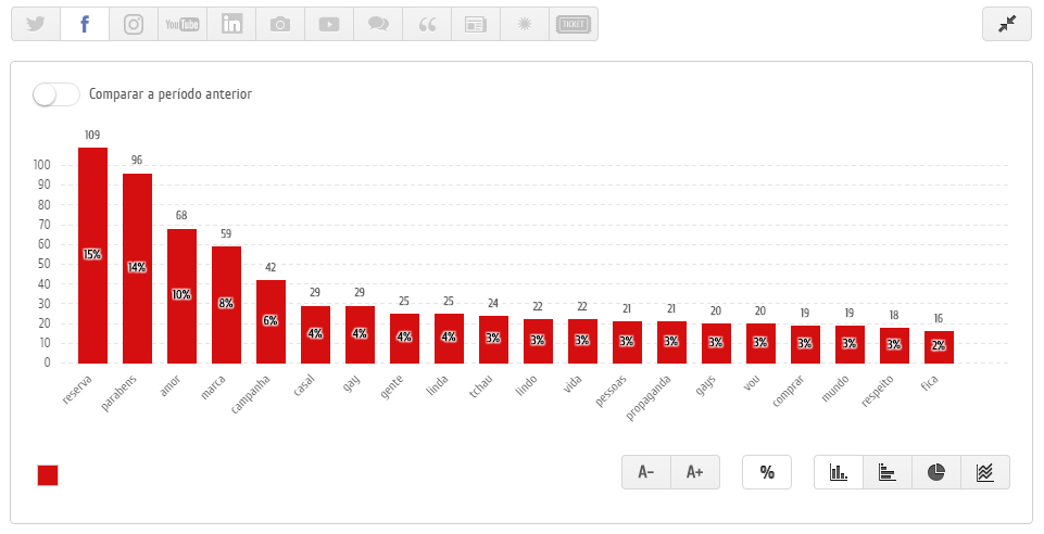 Isolamos a publicação com a campanha da Reserva e analisamos os termos mais mencionados nos comentários do post. Percebemos que os termos positivos se sobressaíram em relação aos termos negativos sobre o vídeo: