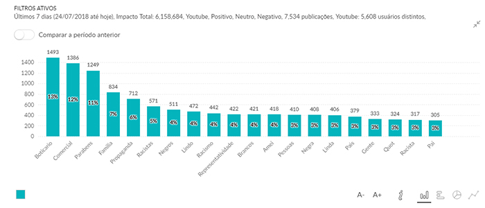 Os termos refletem a ambiguidade da repercussão da campanha. Entre os principais termos dos comentários, destacamos as menções aos termos “Parabéns” 1.249 vezes, “Racistas” 571 vezes e “Representatividade” 422 vezes. Podemos inferir que está acontecendo um debate entre quem defende a campanha e quem está disseminando o discurso de ódio.