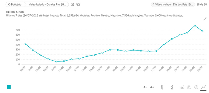 No caso da campanha do Boticário, o pico de interações é às 22h. Esse é o momento em que a marca deve estar mais atenta à repercussão de sua campanha e ao que os internautas estão falando.