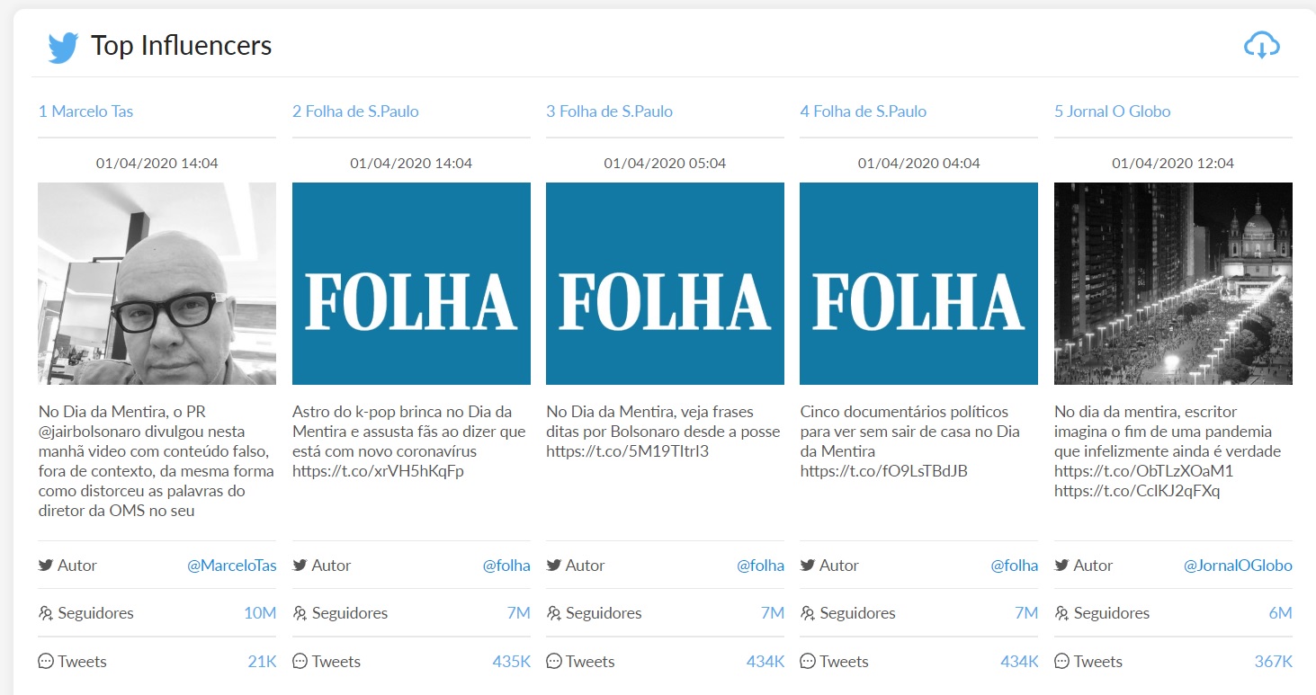 No Twitter, influenciadores aproveitaram o dia da mentira para divulgar conteúdos mais diversificados. O Metrô de São Paulo fez uma publicação alertando sobre as Fake News e a importância de manter a segurança. Por outro lado a Folha de São Paulo apareceu no nosso Top 5 com dicas de documentários políticos e uma brincadeira de um artista sul-coreano.