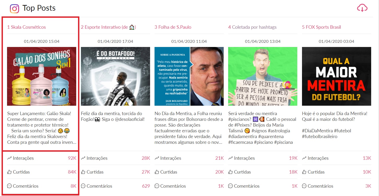O Instagram vem mostrando sua força em relação ao conteúdo publicitário. O destaque é o post da marca de cosméticos Skala, que aproveitou o dia da mentira e conseguiu alcançar 92 mil interações, exatamente 69,57% de diferença para a segunda publicação que aparece no nosso Top 5 do instagram.