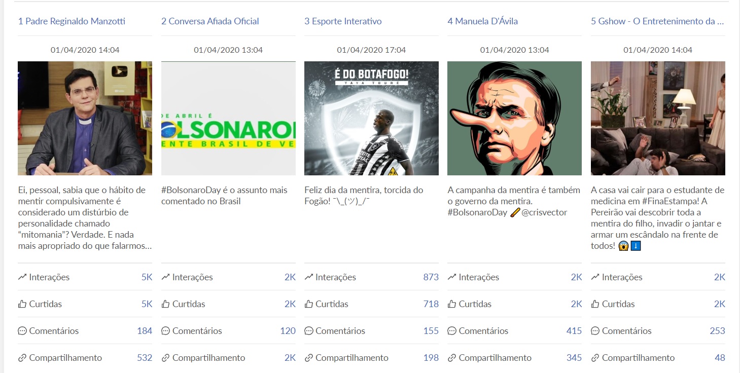 A publicação de Facebook com mais interações no dia de hoje é do Padre Reginaldo Manzotti, com mais de 5.000 interações. O post trata de um vídeo no seu canal do YouTube sobre o hábito de mentir compulsivamente, tratado como um distúrbio de personalidade chamado “mitomania”. Também se destacaram posts que questionam o posicionamento de Jair Bolsonaro sobre a crise.