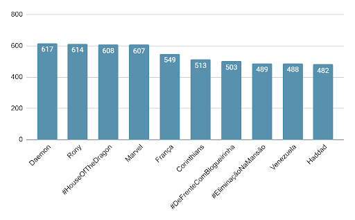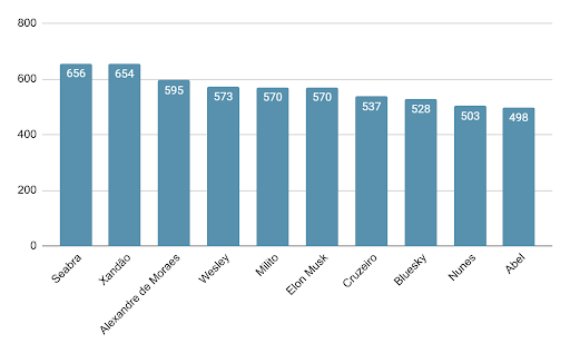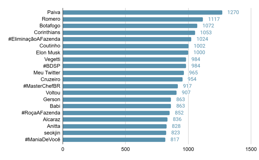 As polêmicas entre Elon Musk e a justiça brasileira também se fizeram presentes e angariaram a 7ª posição, com 1.000 ocorrências na lista. No mesmo tema, Meu Twitter, utilizado para enfatizar que a rede era dos usuários e não de Musk, e Voltou, para quando a plataforma voltou a operar no Brasil, também se destacaram.