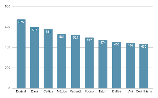 Além disso, o apagão em São Paulo colocou a Enel no mapa das conversas do X. No futebol, o Botafogo gerou conversas pelos resultados na Libertadores, o Cruzeiro por sua performance no Brasileirão e o técnico Rafael Paiva por sua liderança junto ao Vasco.