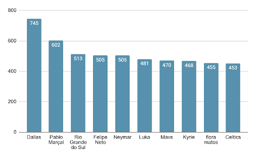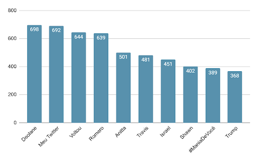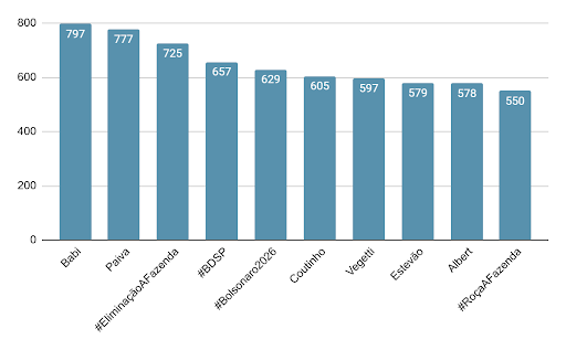 Outro tema que também marcou presença foi o Entretenimento. O Reality A Fazenda esteve duas vezes na lista dos top 20. Primeiro com #EliminaçãoAFazenda, com 1.024 ocorrências, mas também com a participante Babi Muniz, presente 863 vezes e com #RoçaAFazenda, que emplacou a lista 852 vezes.