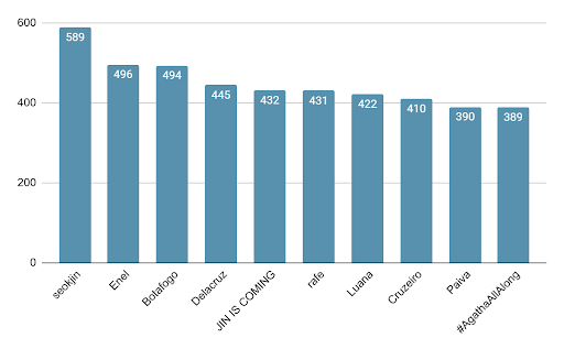 Além disso, o novo álbum de Delacruz e a polêmica do cantor com Flora Matos colocaram o rapper na lista de conversas. Rafe, do sucesso Outer Banks, transmitido pela Netflix, também se destacou. A participante Luana, do reality A Fazenda gerou assunto e a série Agatha All Along, da Disney+, emplacou a hashtag #AgathaAllAlong.