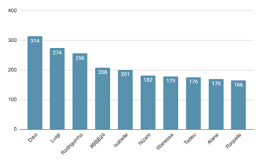A hashtag do programa, #BBB24, também compõe a lista e, junto à participante Isabelle fecha os top 5. Além disso, os brothers Nizam, Wanessa Camargo, o apresentador do reality, Tadeu Schmidt e as participantes Alane e Raquele completam os top 10.