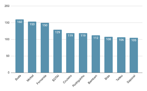 Também esteve presente na lista a criptomoeda $GTAI, que, em algum momento do mês se tornou piada pelo fato de os usuários não entenderem do que se tratava. A brincadeira viralizou e dezenas de posts sobre temas complexos acabaram utilizando o termo.