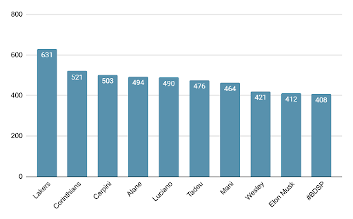 Por último, observamos o começo das altercações entre Elon Musk e a justiça brasileira quando o Supremo incluiu o bilionário no inquérito sobre milícias digitais. Temos também a primeira ocorrência da hashtag #BDSP, do jornalístico Bom Dia São Paulo, da Globo.
