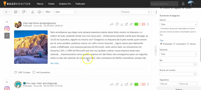 Agora é possível visualizar as imagens das publicações dentro do próprio Buzzmonitor, já na listagem de posts abaixo do gráfico, e ampliá-las para ver com mais detalhes o conteúdo de cada foto. É possível também visualizar logo abaixo do post todos os comentários que foram feitos. Por exemplo: se o analista estiver monitorando um influencer e ele fizer parceria com uma marca para a divulgação de um produto, com apenas alguns clicks o analista poderá ver as imagens que o influencer está publicando e todos os comentários de seus seguidores sobre aquele assunto.