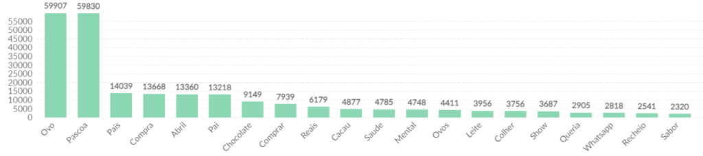 Na análise dos top 20 termos, podemos perceber o quanto os usuários estão desejando receber ou ganhar ovos dos “pais” ou “pai”. A Páscoa remete ao momento em família e mesmo os adultos relatam desejo pelos doces.