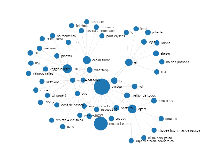 No gráfico de relação entre temas é possível perceber que dentre os produtos da Cacau Show, os usuários têm preferência pelo ovo “dreams 7 chocolates”. A marca Kopenhagen, apesar de não mencionada diretamente, está presente com o seu ovo “repleto de 4 clássicos”. A ação da Burguer King com a Lacta também gerou bastante buzz nas redes sociais, por isso a presença inusitada de “veggie burguer” e “whopperjr” entre os destaques. A ação, realizada em 09/04, consistiu em um combo especial de hambúrgueres vegetarianos, refrigerante, batatinha frita e um ovo da Lacta no sabor Sonho de Valsa pelo valor fixo de R$54,90.