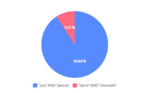 Quando falamos em volume de menções, os ovos são os mais citados entre noticiosos e influenciadores. Esse resultado foi extraído a partir da análise da Buzzmonitor Trends. No período de 11/03 a 11/04, foram detectados 67.836 posts citando “ovo” AND “páscoa” e apenas 6.848 posts citando “barra” AND “chocolate”. Somando o volume das duas buscas, o ovo de Páscoa domina o buzz com 90,83% das menções no período.
