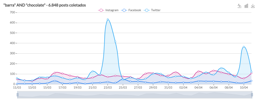 Volume de posts que mencionam “barra” AND “chocolate” – Período 11/03 a 11/04