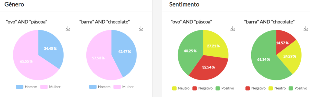 Quando falamos de sentimento e gênero dos usuários que falam de ovos de Páscoa e barras de chocolate, podemos perceber como os ovos são mais citados por mulheres, enquanto as barras são mais comentadas por homens. Já na percepção dos usuários sobre os temas a barra de chocolate está mais associada a menções positivas, o que pode estar associado à diferença de preços. Enquanto 40,25% dos post sobre ovos de Páscoa são positivos e 32,54% negativos, nas menções à barra de chocolate o sentimento é 61,34% positivo e apenas 14,57% negativo.