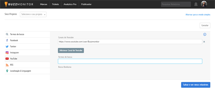 - Para monitorar o canal da sua marca no YouTube, coloque o link no campo Youtube Channel, na aba YouTube. Você pode adicionar mais de um canal e também cadastrar termos específicos que deseja monitorar.