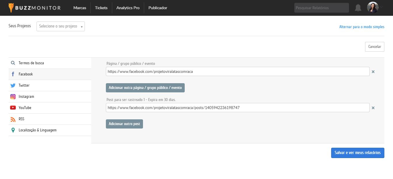 - No aba Facebook você colocará o endereço da sua página no Facebook. Você pode, também, cadastrar um grupo no Facebook (aberto ou fechado), basta inserir o link no campo Fanpage/Public Group. É possível também cadastrar um post específico para rastrear durante 30 dias.