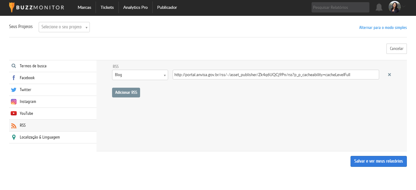 - Na aba RSS, cadastre uma RSS que você deseja monitorar, seja de blog, fórum, imagem, etc. Saiba mais aqui.