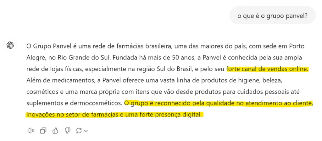 E olha que legal: hoje, quando perguntamos ao ChatGPT o que é o Grupo Panvel, a IA enfatiza o reconhecimento da marca pela qualidade no atendimento ao cliente, inovações no setor de farmácias e sua forte presença digital.