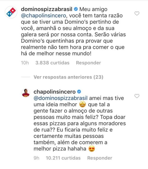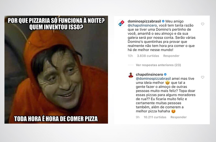 Uma interação espontânea no Instagram este mês entre a @dominospizzabrasil e o @ChapolinSincero trouxe uma lição importante para as marcas: entender e responder rapidamente a questões sociais pode desencadear uma percepção positiva para a marca.