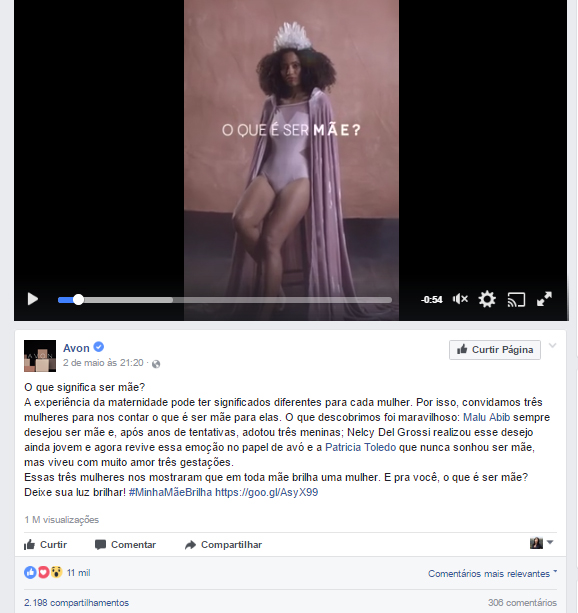 A campanha da Avon, publicada no dia 2 de maio, sobre “ser mãe”, obteve mais de 11 mil curtidas, mais de 2 mil compartilhamentos, 306 comentários e mais de 1 milhão de visualizações.