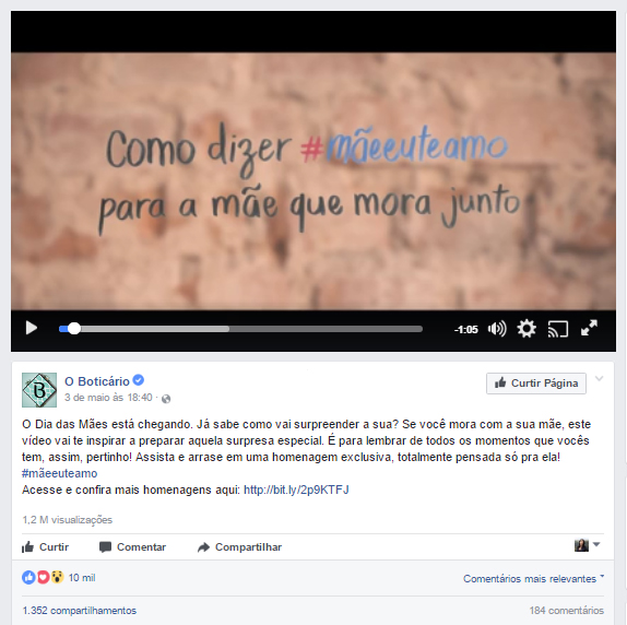 O Boticário publicou um vídeo no dia 3 de maio com o mote “surpreenda a mãe que mora com você”. A campanha, compartilhada mais de 1.300 vezes, obteve mais de 10 mil curtidas, pouco menos do que a concorrente. Além disso, o vídeo teve apenas 184 comentários, pouco mais da metade do que a Avon, e obteve 1,2 milhões de visualizações, mais do que sua concorrente.