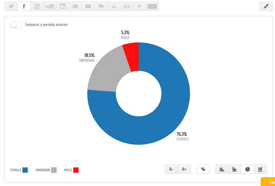 Durante o período monitorado, verificamos que 76% dos consumidores que interagiram com a campanha eram mulheres, enquanto apenas 5,3% eram homens. O restante dos usuários (18%)  não especificaram o gênero no momento de cadastro da conta na rede social.