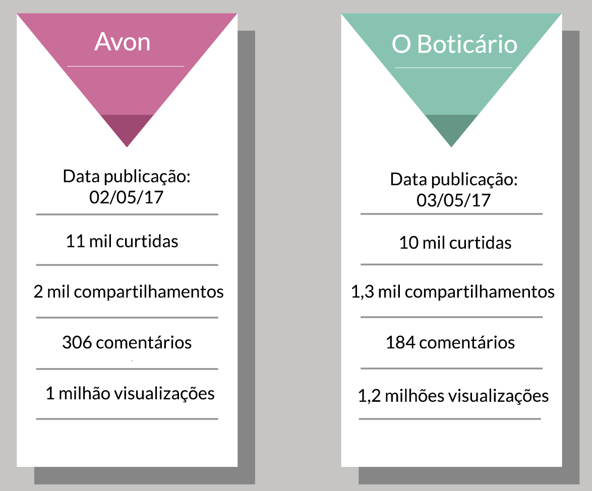 A campanha da Avon recebeu mais comentários, depoimentos de clientes satisfeitos e compartilhamentos, enquanto a campanha do Boticário teve mais visualizações do que a da concorrente. Ambas as campanhas tiveram um número próximo de curtidas, mas ainda assim o engajamento foi maior na campanha da Avon, apesar do vídeo do Boticário ter mais visualizações.