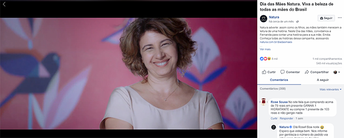 A campanha da Natura gerou menos buzz e, por consequência, teve menor engajamento. Optamos por monitorar apenas um dos posts feitos pela marca divulgando o vídeo de sua campanha do Dia das Mães, mas observamos que diversas publicações foram feitas.