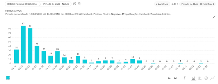 O post da Natura foi publicado no dia 16 de abril e teve um pico de buzz no dia seguinte. Conforme os dias foram passando, a publicação foi perdendo força rapidamente.