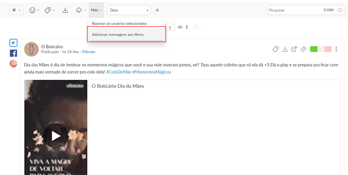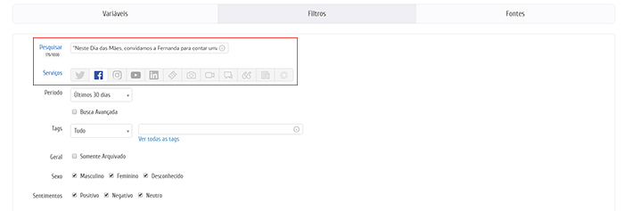 2. Na parte de Filtros insira no campo de pesquisa trechos de ambas as publicações entre aspas e com o termo booleano OR entre elas. Ex: “Neste Dia das Mães, convidamos a Fernanda para contar uma história para a sua mãe, Emilia” OR “Dá o play e se prepara pra ficar com ainda mais vontade de correr pro colo dela”. Lembre-se de deixar ativo apenas o serviço de Facebook e na parte Fontes apenas as marcas que você está monitorando.
