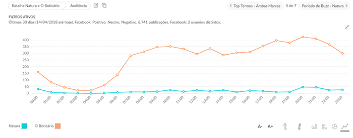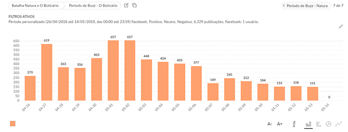 Já a publicação do Boticário foi feita no dia 26 de abril, 10 dias depois de sua concorrente. Nos dias 01 e 02 de maio a publicação teve dois picos de buzz, mas até o momento desta publicação continuou tendo repercussão entre os internautas.