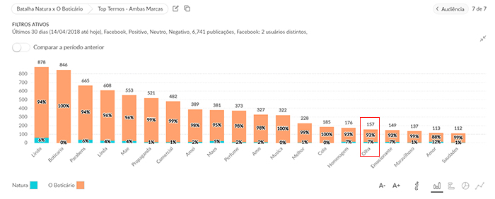 Entre os destaques, o termo “olha”, presente nos comentários de ambas as marcas. O Boticário fica com 93% dos comentários “Olha”, enquanto a Natura tem apenas 7%.
