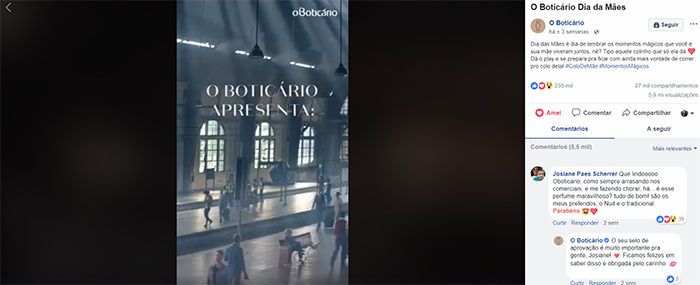 O Boticário criou apenas uma campanha e focou nesta divulgação para alcançar o maior público possível. Os comentários ajudaram na viralização, já que os internautas que se identificavam com aquela história marcavam outras pessoas para assistirem ao vídeo, usando o termo “olha” para isso.