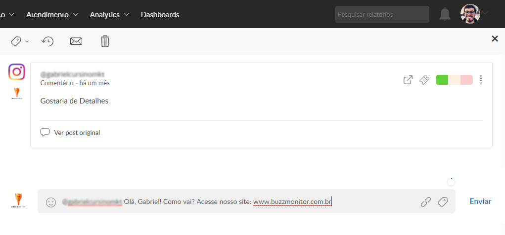 Agora é só escolher o post e clicar em Responder. Você será direcionado para a página de Atendimento do Buzzmonitor, onde pode interagir diretamente nas publicações, sem precisar acessar a rede social.