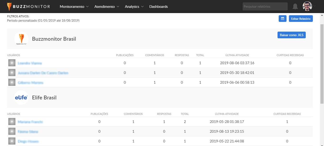 Pronto, o seu relatório está feito! Nessa página você verá quais são os usuários que mais interagem com as publicações da sua marca.