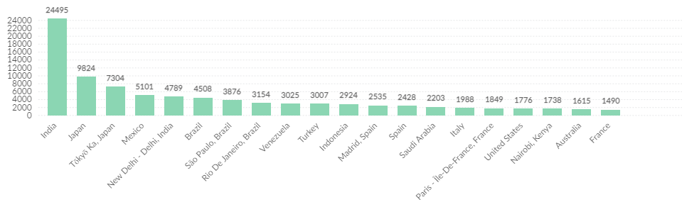 Em 2 desses países, temos também as capitais aparecendo como uma origem de grande volume de tweets, como é o caso de Tóquio (7.304 tweets) e Nova Delhi (4.709 tweets).