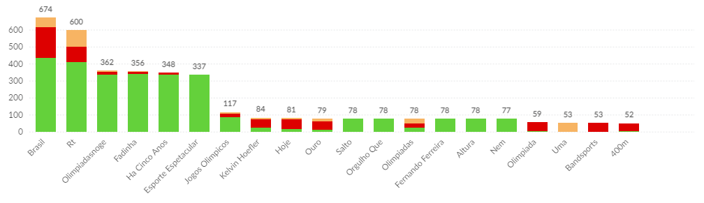 Além de acompanharem as últimas atualizações dos jogos olímpicos nas redes sociais, os internautas buscam informações na TV. Isso fica claro na aparição dos termos Esporte Espetacular (337 tweets) e Bandsports (53). Além do volume, o sentimento sobre os dois canais se diferencia bastante, com percepção mais negativa para a Band e mais positiva para a Globo.