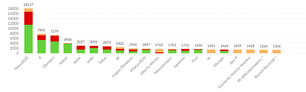 Na análise de assuntos mais citados, vemos a torcida pela delegação da Índia e Japão, além do destaque de tweets citando o venezuelano Alberto Mestre. Ele, que é filho de um nadador de mesmo nome que representou o país nas olimpíadas de Moscou e Los Angeles, foi mencionado em 1.765 posts. Além disso, o termo “Record Nacional” (presente em 1.356) também está relacionado ao nadador. É que durante a sua classificação para os jogos de #Tokyo2020 ele atingiu um novo recorde para os 800 metros livres.