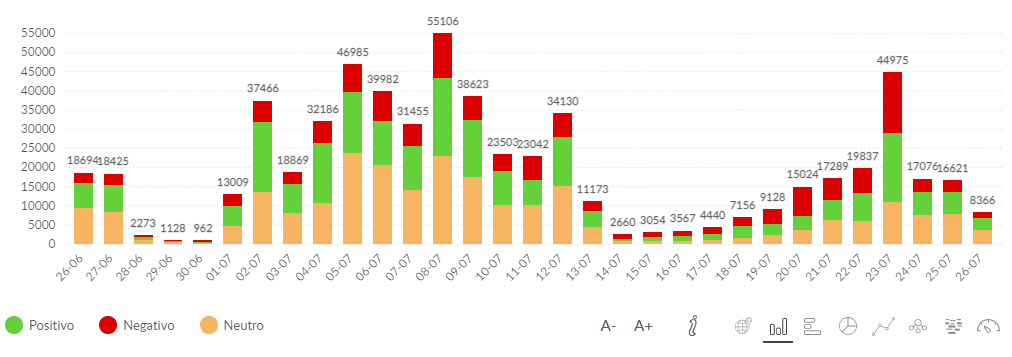 Em 08/07, a organização do evento anunciou a proibição de plateia nos jogos olímpicos devido às restrições da Covid-19. Nesse dia, foram 55.106 menções à hashtag #Tokyo2020, representando um volume de buzz 18% maior do que no dia da abertura, quando a hashtag foi citada em 44.975 tweets.