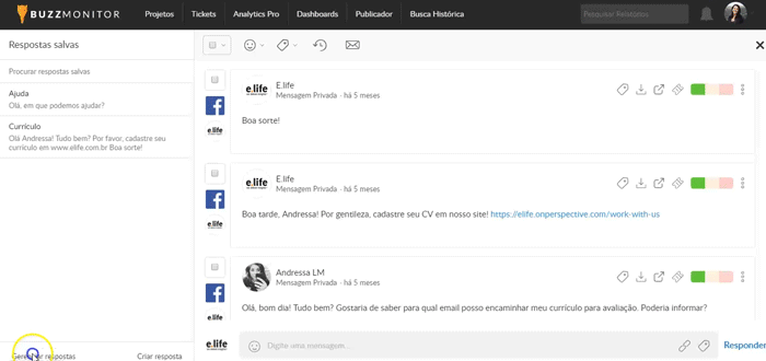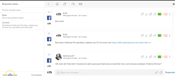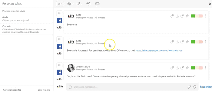 As Respostas Salvas permitem que o social media guarde respostas para as mensagens mais frequentes. Por exemplo, na página da E.life recebemos muitas perguntas sobre vagas de emprego e normalmente pedimos para que a pessoa nos encaminhe seu currículo. Ao criar uma resposta padrão para essa interação, ganhamos tempo para responder demais usuários sobre outros assuntos.