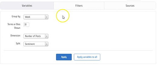 Na tela a seguir, na aba Variáveis (Variables) selecione as opções: Group by > Term; Dimension > Number of Posts; Split > No split.