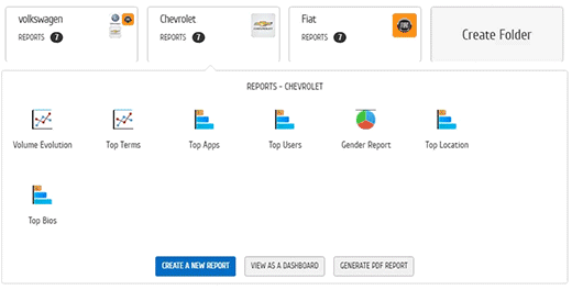 A primeira coisa que deve ser feita é clicar na aba de Monitoring, na tela principal do Buzzmonitor. Escolha a pasta do projeto e clique na opção “Create new report”. Defina um nome para o seu novo relatório e salve-o: