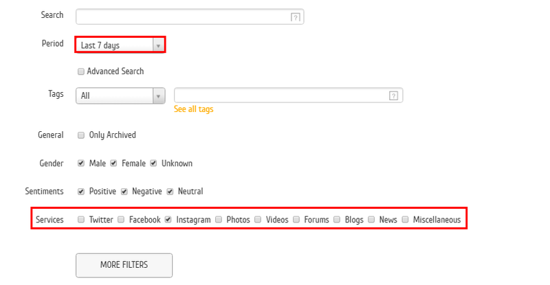 Na aba Filtros (Filters) selecione o período que deseja monitorar e assegure-se de que na opção Serviços (Services) esteja apenas o Instagram;