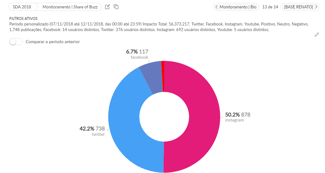 Um relatório de Share of Buzz é importante para entender quais são as redes sociais com mais publicações durante o evento. No caso do Salão do Automóvel, a rede social mais usada foi o Instagram, seguida pelo Twitter. O Facebook aparece com um buzz muito pequeno quando comparado às duas primeiras.