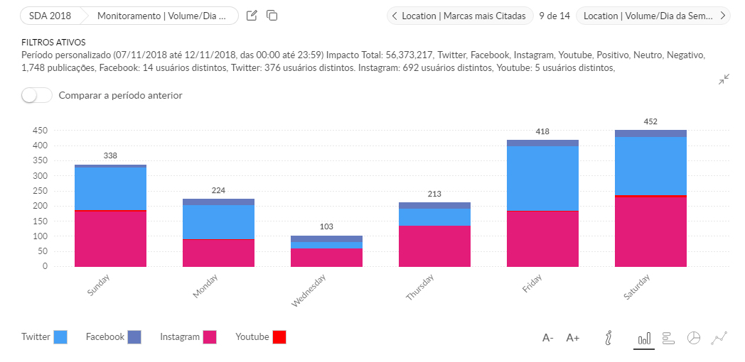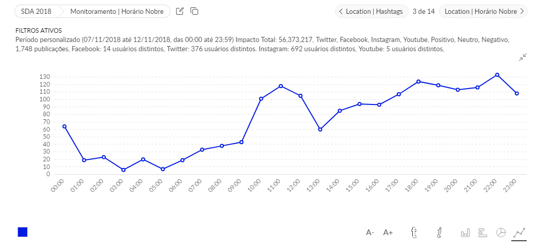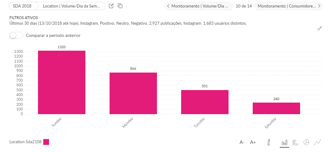 Por outro lado, outros dados são distintos, como os horários com mais buzz, assim como os dias da semana com maior volume de publicações. Assim, o monitoramento geolocalizado ganha ainda mais importância, principalmente durante shows, palestras e eventos que reúnem um volume muito grande de pessoas falando sobre determinado acontecimento.