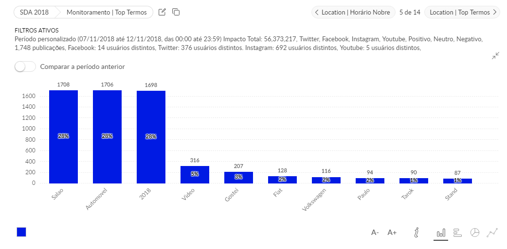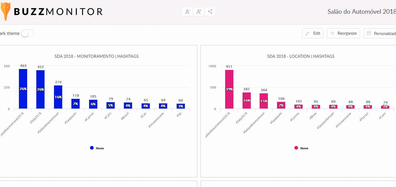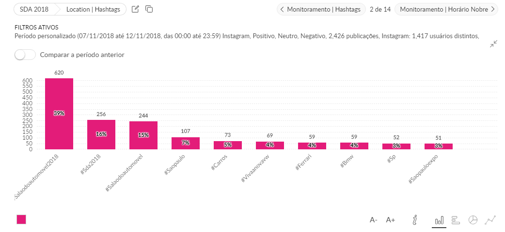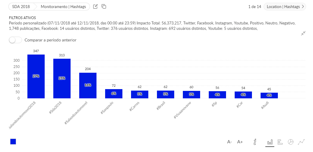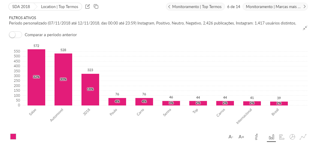 Tanto o monitoramento da marca Salão do Automóvel e das marcas presentes no evento, quanto a geolocalização São Paulo Expo mostraram alguns dados muito similares, como principais hashtags e termos, oferecendo o insight de que marcar localizações em postagens é um comportamento recorrente dos internautas.