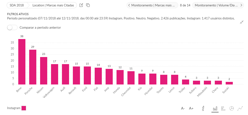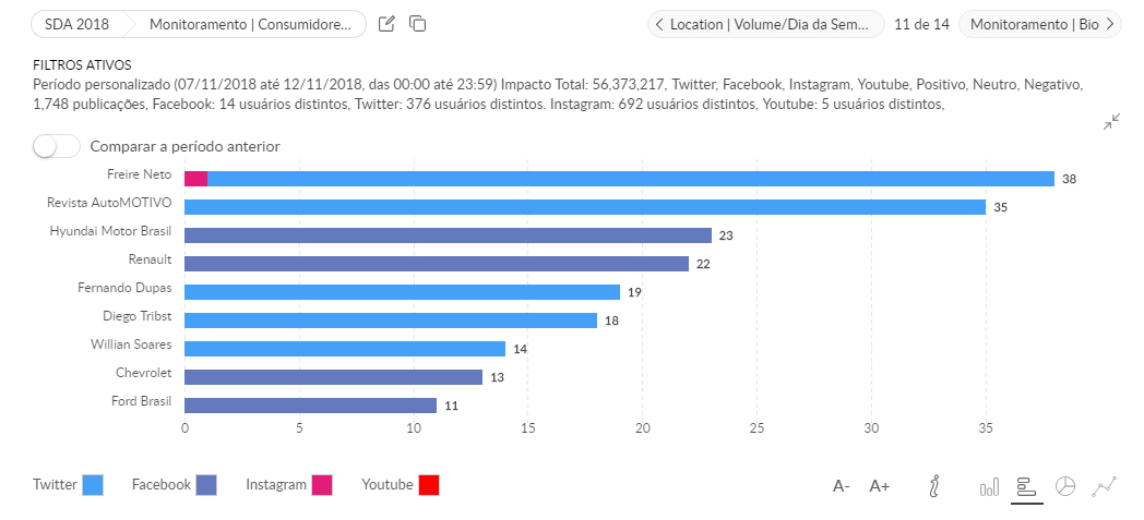Entre os dias 8 e 18 de novembro aconteceu em São Paulo a 30ª edição do Salão do Automóvel, com a presença de todas as marcas automobilísticas comercializadas no Brasil. Para o monitoramento, selecionamos o período de 7 a 12 de novembro.